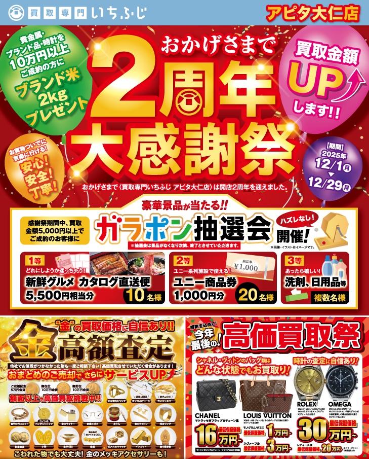 いちふじ アピタ大仁店にて2周年”大感謝祭”を開催!【12/1(月)〜12/29(月)】金 貴金属 ブランド 時計を高価買取!