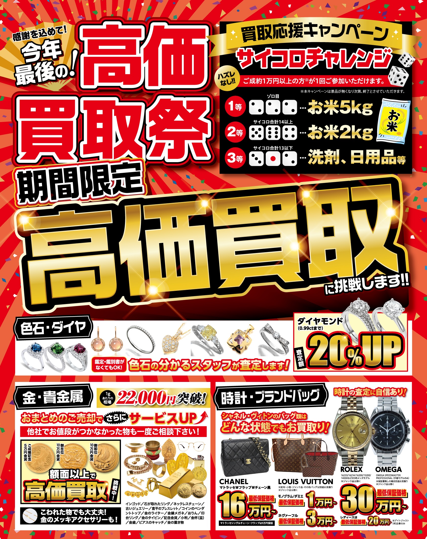 【12月!高価買取祭】感謝を込めて今年最後のお米サイコロチャレンジ!金 貴金属 ブランド 時計など高価買取中! 静岡・愛知・東京・神奈川・群馬で買取ならいちふじ